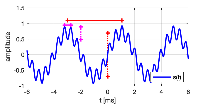 où A_1 et A_2 sont les ampltudes, F_1 et F_2 les fréquences, et \phi_1 et \phi_2 les phases par rapport à une référence commune.