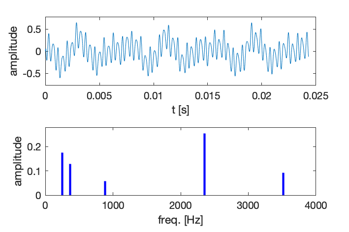 Par exemple, en écoutant le signal ci-dessous, qui contient 5 fréquences superposées, l’analyse est difficile, voire impossible, à partir du signal temporelle, ou même à l’écoute .