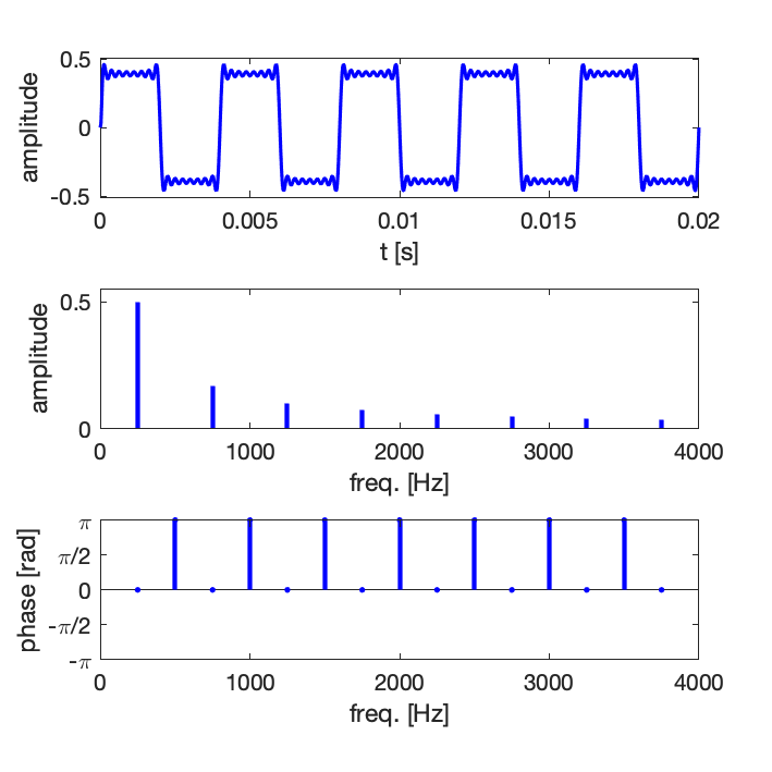 Comme en pratique la série ne peut pas être infinie, on observe des oscillations résiduelles, il s’agit du phénomène de Gibbs [en savoir plus sur Wikipedia].