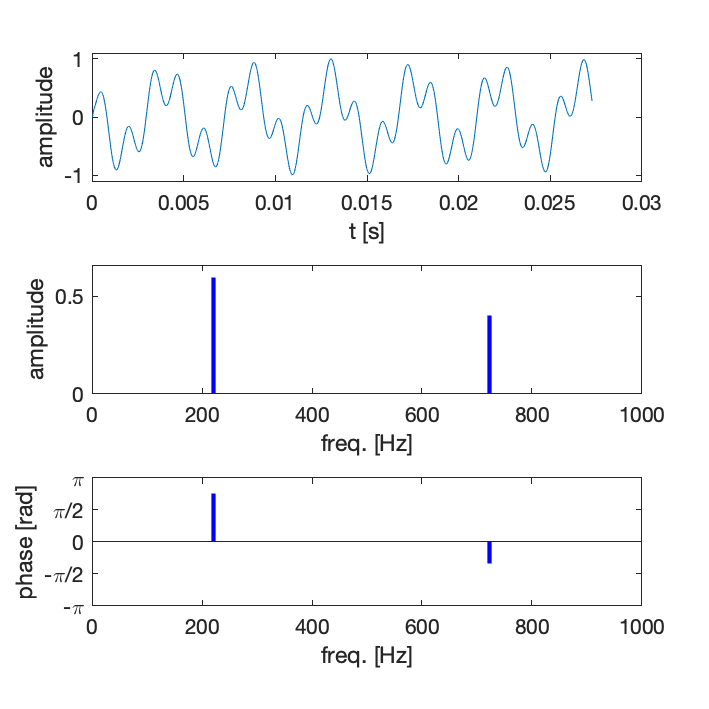 Le signal et ses composantes sont représentées ci-dessous en fonction du temps, ainsi qu’en fonction de la fréquence en traçant l’amplitude et la phase des composantes :