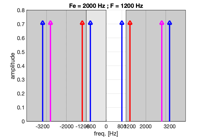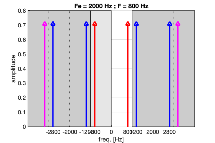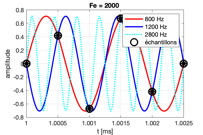 Si on considère l’exemple d’un échantillonnage à Fe = 2000 Hz d’un signal à F = 800 Hz, on s’apperçoit que plusieurs sinusoïdes passent par ces points. Elles sont telles que leur fréquence vaut (\pm n F_e) \pm F, c’est-à-dire : (\pm) 800 Hz, 1200 Hz, 2800 Hz, 3200 Hz, 4800 Hz, …